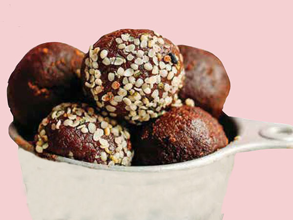 Formiramo manjše kroglice, ki jih potresemo ali obložimo z oluščenimi konopljinimi semeni, zmletimi chia ali lanenimi semeni (zmeljemo le majhno količino, povaljamo kroglice in takoj pojemo, da ne pride do oksidacije omega 3 v semenih), prahom divjih borovnic, goji jagod, z liofiliziranim sadjem ali uporabimo druge nutritivno bogate posipe.