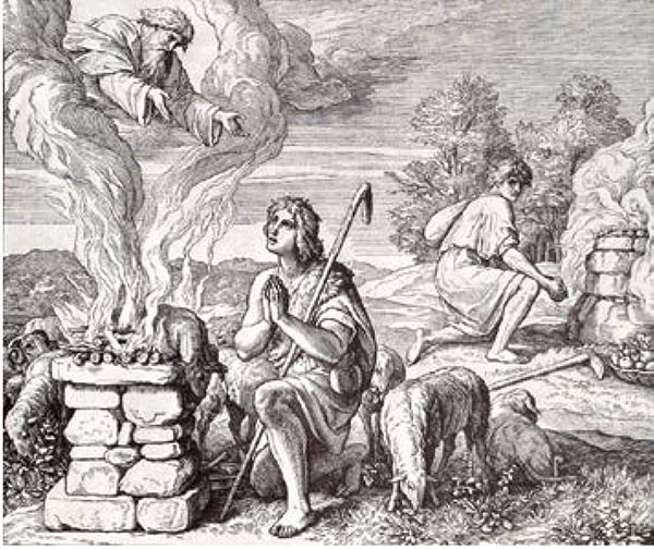 Prizor iz Stare zaveze Svetega pisma: Kajn in Abel zažgeta jagnje kot živalsko žrtev.