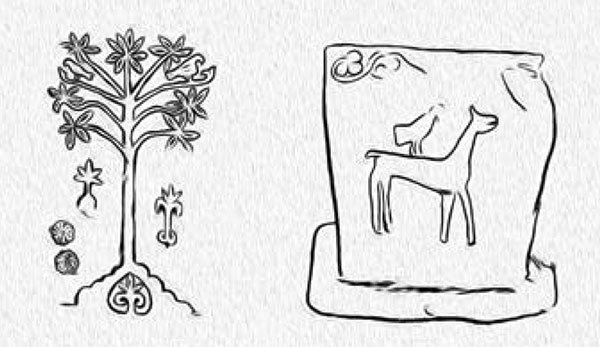 - Stilisierter Baum mit Früchten und Vögeln auf einem stećak in Donja Zgošća bei Kakanj in Bosnien-Herzegowina nördlich von Visoko, dem einstigen Königssitz des bosnischen ban – Pferd mit einem Vogel auf einem stećak bei Ljubinje zwischen Mostar und Dubrovnik: © die-bogomilen.de