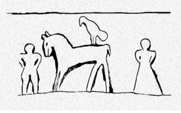 Moški in ženska s konjem in ptico, ki zelo verjetno simbolizira dušo, na stečku pri Ljubinju v Bosni in Hercegovini.