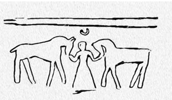 - Darstellung einer Frau unter einer Mondsichel mit zwei Pferden, auf einem stećak in Ljudovo zwischen Mostar und Dubrovnik: © die-bogomilen.de